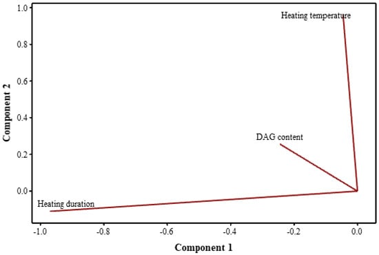 The PLS model employed had two components with an R2 value of 0.7775 and a p-value less than 0.05, thus authenticating its validity. The load diagram compares the relative influence of each prediction variable on the response. In this study, the line corresponding to DAG content was short, indicating the weak correlation with 3-MCPDE and GE (Figure 3). The lines of heating temperature and duration were very long, indicating that they were more relevant to 3-MCPDE and GE.