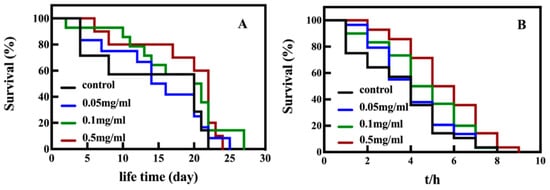 The N2 nematodes at L1 stage were inoculated in the NGM plate which contained 50 μM 5-FUdR to prevent offspring generation. After 44 h, the nematodes grew to L4 stage, and the culture plate was changed daily. As a comparison, the nematodes were inoculated in the NGM plates containing E. coil OP50 with different concentrations or without SPO. The inoculation was maintained at 20 °C, and the survival status was examined daily with a stereomicroscope (LEICA Microsystems CMS Gmbh, Wetzlar, Germany) until all nematodes died. Thirty nematodes were used for every experiment, of which there were three replications.
