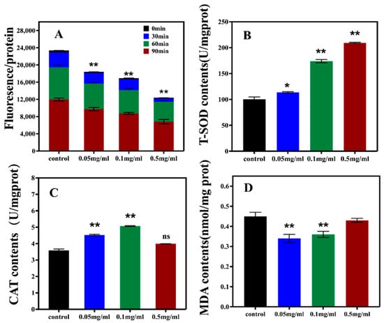 Effect of SPO on ROS (A), activity of SOD (B) and CAT (C), and MDA contents (D). All data are expressed as mean ± SD, analyzed with ANOVA with the Dunnett’s comparisons test (post-hoc), relative to control * p < 0.05, ** p < 0.01, ns—no significance.