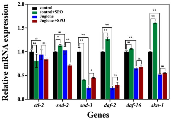 Compared to the sample treated with juglone, the expression level of sod-3 gene of nematodes treated with juglone and SPO was up-regulated by 1.10 times (p < 0.05), the expression level of daf-2, daf-16, and skn-1 and ctl-2 genes were not significantly changed (p > 0.05). The expression level of sod-2 gene was down-regulated by 0.69 times (p < 0.05). The result suggested that sod-3 is the key gene for the anti-oxidative stress effect of SPO. The results suggested that SPO activated sod-3 gene to resist the oxidative stress damage induced with juglone.