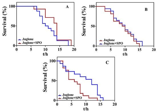 The oxidative stress of C. elegans was determined according to the reported protocol [] with minor modifications. Briefly, the N2 and the mutant strain nematodes (CB1370 [daf-2(e1370) III], GA186 [sod-3(tm760) X], EU31 [skn-1(zu135) IV/nT1 [unc-?(n754) let-?] (IV; V)]) at L4 stage were inoculated in the NGM plate with or without SPO for 24 h. After that, the corresponding nematodes were transferred to the NGM plate with 200 μM juglone, and the living nematodes were counted every one hour by a stereomicroscope. The cultivation temperature was 20 °C. The experiment was replicated three times.