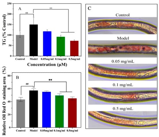 The impact of SPO feeding on triglycerides (TG) levels in nematodes was demonstrated in Figure 5A. It was observed that the in vivo TG levels of nematodes were decreased with the increasing SPO feeding. For example, compared with the model, the TG level decreased by 21.73%, 39.07%, and 51.85% (p < 0.05) as 0.05, 0.1, and 0.5 mg/mL SPO were fed accordingly. The result indicated that the SPO feeding reduced the TG levels of nematodes.
