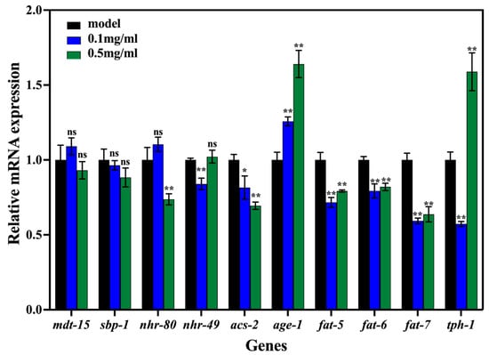Compared with the model, the expression level of nhr-49 gene was not significantly changed with the SPO feeding (p > 0.05), but the expression level of nhr-80 gene was down-regulated by 0.74 times as 0.5 mg/mL SPO was fed (p < 0.05). Nhr-80 and nhr-49 are the nuclear hormone receptors in C. elegans which regulate the delta 9-desaturase transcription [,,]. It has been reported that the absence of fat-6 or fat-7, nhr-80 can up-regulate the fat-5 gene transcription [].