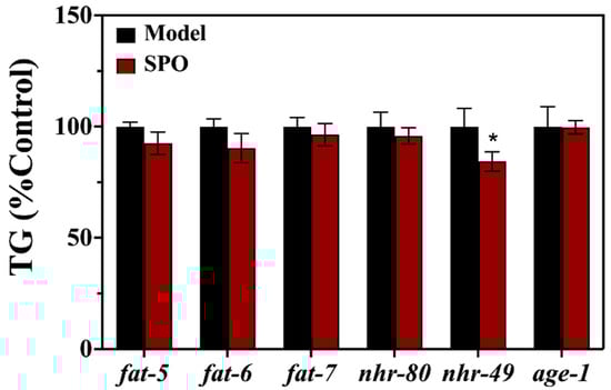 Effects of SPO on TG in mutants. All data are expressed as mean ± SD. The Student’s t-test was used for comparison, relative to model * p < 0.05.