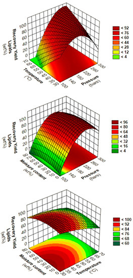 Contrarily, the temperature term alone is not significantly influent in this study, since temperature is one of the most difficult parameters to interpret from the obtained results. The increase of temperature reduces the density of CO2, decreasing the solvating power of CO2 [61]. In another hand, the increase of temperature leads to an increase of the vapor pressure of solute, resulting in higher solubility of solutes in CO2 [40]. The increase of temperature also decreases the viscosity of CO2, thereby promoting the diffusion of CO2 through the SCG matrix. In this study, the positive effects of temperature are predominant in a pressure above 200 bars, where density remains sufficient to dissolve lipids. Hence, the temperature influence should be interpreted as a function of the pressure.