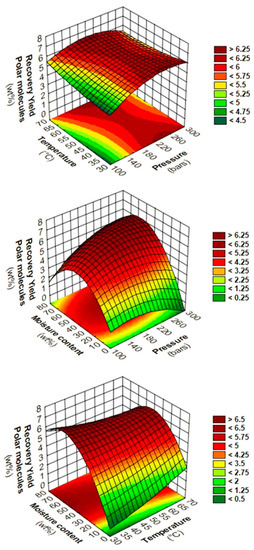 Indeed, in this study, high temperature above 50 °C shows strong antagonistic effects when it is combined with pressure below or equal to 150 bars. The experiments that were performed at 150 bars, 20 wt% moisture content at 40 °C (−1), and 60 °C (+1) display RYL of 85.23 and 29.13 wt%, respectively. Concomitantly, significant differences of CO2 density from 780.23 to 604.09 kg·m−3 were observed. This negative combination of low pressure and high temperature is a phenomenon called retrogradation [60,65], as shown on the response surfaces or contour plots in the grey area of P*T parameters interactions (Figure 1).