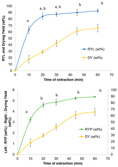 where Y is the response variable, is the constant coefficient, is the linear coefficient, is the quadratic coefficient, and is the two factors interaction coefficient. The accuracy of the model was determined with the analysis of variance (ANOVA), including the evaluation of the lack of fit, coefficient of determination (R2), and the Fisher test value (F-value). All statistical calculations were made for a confidence level superior at 95% (i.e., with p < 0.05). RSM and ANOVA results were generated by the Minitab 17 software (Pennsylvania, PA, USA). Student’s tests for the kinetics of extractions were carried out with the software R (4.0.3 version).