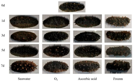 After their arrival at the lab, the sea cucumbers were immediately treated. The live sea cucumbers were stored by four methods, including the seawater method, the oxygenation method, the ascorbic acid treatment method, and the frozen method. The live sea cucumbers were distributed in plastic bags, which were 20 cm long × 25 cm height with a total volume of 1 L at the density of 1 individual per bag. The seawater group was filled with 600 mL seawater. The bags of the oxygen group were filled with 600 mL seawater, air, and oxygen (99%, w/w). The volume of added oxygen accounted for 25% (v/v) of the total gas. In the ascorbic acid treatment group, 400 mL of air and 600 mL of seawater were filled into the bags. The ascorbic acid (Soleibao Technology Co., Ltd., Beijing, China) was subsequently added to the seawater to the final concentration of 25 mg/L. The bags were sealed and stored in three refrigerators (KE40, Tulian, Shenzhen, Guangdong, China) for 7 days in darkness at 4 °C. In the freezing group, the sea cucumbers were directly stored in the −20 °C refrigerator. The 4 °C refrigerators were shaken twice a day with 10 min per shake to simulate the transportation conditions. Samples were taken out on days 0, 1, 3, 5, and 7 to test. The sea cucumbers in different treatment groups were washed, the viscera removed, boiled for 5 min at 100 °C, and cooled down to room temperature for tests. Sea cucumbers at day 0 were used as the fresh control.