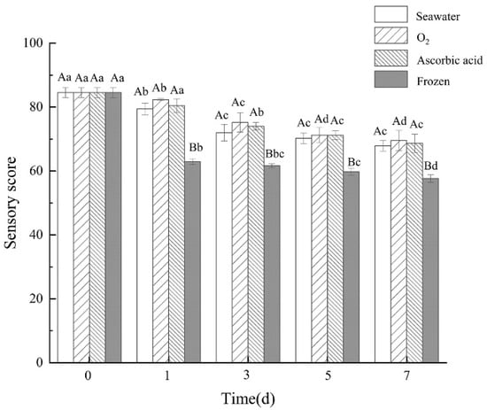 Sensory score of boiled sea cucumbers in different treatment groups during storage. Dates are presented as mean ± SD (n = 6). Different capital letters indicate significant differences in the average between groups. Different lowercase letters indicate significant differences in the average value within each group (p < 0.05).