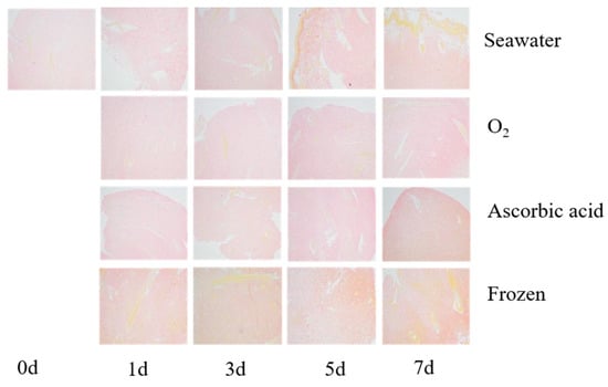 The sea cucumber body wall in different treatment groups were boiled, sliced, stained, and observed to compare the storage effect on tissue structure (Figure 3). The myofibril showed yellow, and the collagen was red after the body wall tissue staining by V-G dye. In the fresh samples, the collagen fibers are intact with regular and compact alignment. After seven days of storage, the space between collagen fibers in the oxygenated group was the smallest and the texture was the best among all treatments. However, the gap between collagen fibers in the frozen group was large and the condition was the worst of all. In the freezing process, the free water in the body wall of the sea cucumber crystallizes, causing the fiber fracture and a gap large between the fibers [].