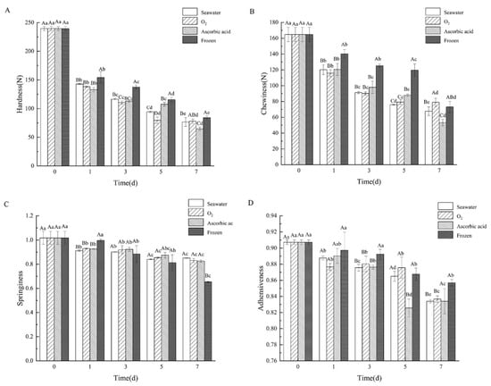 Changes of the (A) hardness, (B) chewiness, (C) springiness, and (D) adhesiveness of boiled sea cucumber body wall (SCBW) in different treatment groups during storage. Dates are presented as mean ± SD (n = 6). Different capital letters indicate significant differences in the average between groups. Different lowercase letters indicate significant differences in the average value within each group (p < 0.05).