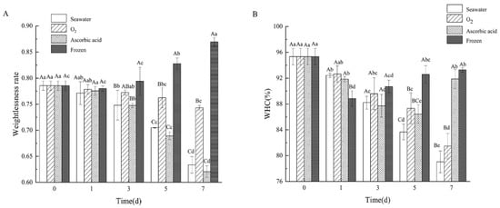 Changes of (A) weightlessness rate and (B) WHC of boiled SJBW in different treatment groups during storage. Dates are presented as mean ± SD (n = 3). Different capital letters indicate significant differences in the average between groups. Different lowercase letters indicate significant differences in the average value within each group (p < 0.05).