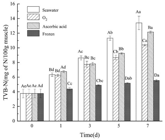 Changes in TVB-N in different treatment groups during storage. Dates are presented as mean ± SD (n = 6). Different capital letters indicate significant differences in the average between groups. Different lowercase letters indicate significant differences in the average value within each group (p < 0.05).