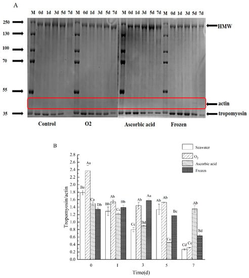 SDS-PAGE (5% Stacking gel and 8% separated gel) analysis of stored sea cucumbers protein by different treatments. (A) Electrophoretic diagram of SDS-PAGE and (B) quantitative analysis of electrophoresis. Relative expression = tropomyosin/ actin. Dates are presented as mean ± SD (n = 3). Different capital letters indicate significant differences in the average between groups. Different lowercase letters indicate significant differences in the average value within each group (p < 0.05).