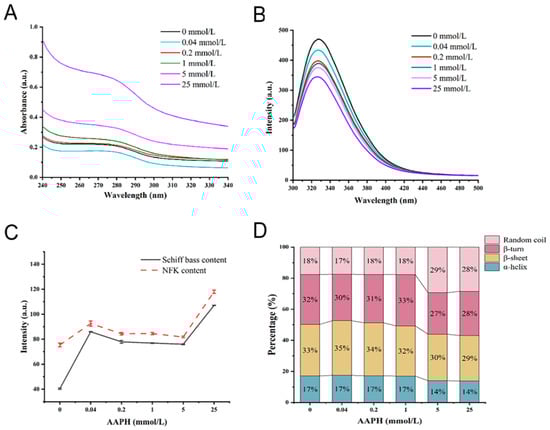 (A) UV absorption; (B) endogenous fluorescence; (C) Schiff base and NFk content; (D) secondary structure. Values of 0, 0.04, 0.2, 1, 5, and 25 represent various AAPH concentrations (unit: mmol/L), and different letters (a–d) indicate significant differences at p < 0.05.