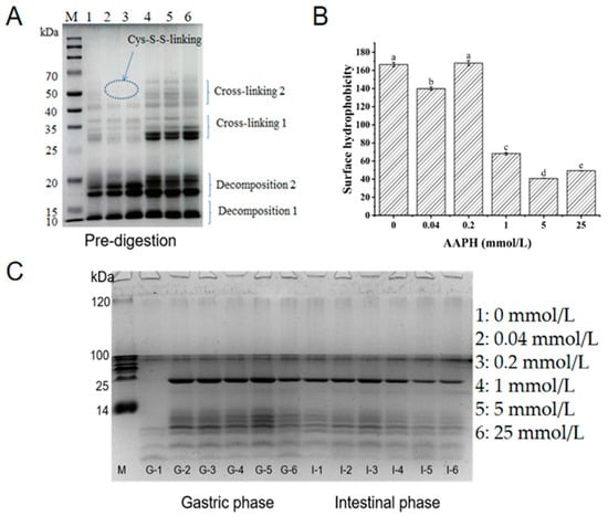 (A) Electrophoresis profiles of walnut isolated proteins after 24 h of incubation with different concentrations of AAPH, the circle shows the cross-linking of two sulfhydryl groups of cysteine due to oxidation; (B) surface hydrophobicity; and (C) small-molecule electrophoresis profiles of walnut isolated proteins after AAPH oxidation in gastric and subsequent intestinal digestion for 2 h, respectively, G: gastric phase, I: intestinal phase, and different letters (a–e) indicate significant differences at p < 0.05.