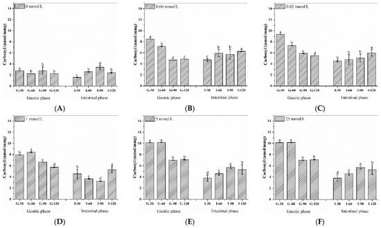 Carbonyl content of walnut isolated proteins after AAPH oxidation in the process of gastric and subsequent intestinal digestion at 30, 60, 90, and 120 min, respectively. (A–F) represent different incubation concentrations of AAPH, and different letters (a–d) indicate significant differences at p < 0.05.