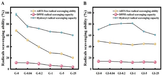 Adopting the method of Georgiou et al. [28], the ABTS free radical scavenging ability, DPPH free radical scavenging ability, and hydroxyl free radical scavenging ability of the hydrolysate were determined.