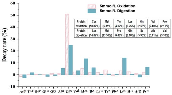 The quantity and composition of amino acids can affect the degree of protein absorption and utilization. Here, we have chosen a representative concentration that is typical (AAPH = 5 mmol/L). As shown in Figure 5, almost all amino acid levels were decreased to varying degrees during in vitro oxidation and digestion. The decay rates of amino acids in walnut samples before and after oxidation are ranked from high to low as: Cys, Met, Tyr, Lys, His, Val, and Pro, and the decay rates of amino acids in walnut samples before and after digestion are ordered from high to low as: Lys, Met, Pro, Gln, Ile, Ala, and Val. Fang et al. [13] showed that Cys, Met, Tyr, and Lys are vulnerable. The most frequent sites of oxidation were determined to be His, Lys, Pro, Arg, Met, and Cys by Stadtman et al. [50]. From the results of the present study, the oxidation of amino acids is selective, and cysteine is the most vulnerable amino acid and is typically the first to be oxidized, despite the fact that theoretically all amino acid side chains are vulnerable to free radical attack. The main byproduct of the oxidation of sulfur-containing amino acids such as Met is methionine sulfoxide, which accounts for the reduced Met level. Since residues such as Cys, Try, Met, Arg, and Lys are frequently the targets of free radicals, amino acids with active side chains, such as those found in sulfhydryl, thioether, amino, mitochondrial, and indole rings, are similarly vulnerable to oxidation.