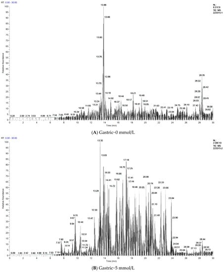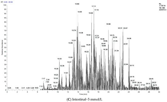 Total ions (X: time, Y: intensity) of walnut protein samples. (A) Sample of gastric digestion that is not oxidized; (B) sample of gastric digestion at the AAPH concentration of 5 mmol/L; and (C) sample of subsequent intestinal digestion at the AAPH concentration of 5 mmol/L.