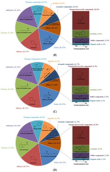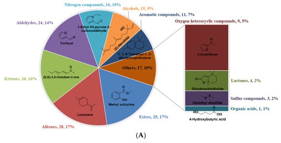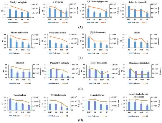 Although it was inappropriate to compare the contents of the VFCs directly using their corresponding peak areas due to the great abundance differences presented in the GC–MS chromatogram brought about by the different functional groups, the peak area of the compounds in the same categories with the same functional groups might provide some references for their concentration distribution orders. Limonene, 1,1,6-trimethyl-1,2-dihydronaphthalene, 2-acetylfuran, dihydroactinidiolide, dimethyl disulfide, and 4-hydroxybutyric acid, which belong to alkenes, aromatic compounds, oxygen heterocyclic compounds, lactones, sulfur compounds, and organic acids, showed the highest concentrations in the corresponding chemical categories in all types of WRTs. Some differences in compounds with the highest concentrations in the other five chemical categories were observed among the four types of WRTs. Methyl salicylate and (E,E)-3,5-octadien-2-one were the most abundant esters and ketones in DHP, RG, and SX, whereas cis-3-hexenyl hexanoate and trans-β-ionone replaced them in the corresponding categories in JF. Among aldehydes, furfural showed the highest concentrations in DHP, while (E,E)-2,4-heptadienal was most abundant in RG, SX, and JF. Among the nitrogen compounds and alcohols, 1-ethyl-1H-pyrrole-2-carboxaldehyde and (E)-nerolidol had the highest concentrations in DHP and SX, whereas the concentrations of benzyl nitrile and phenylethyl alcohol were highest in RG and JF.