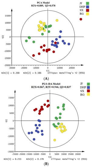 To explore the differences in the distribution of VFCs among the four types of WRTs, unsupervised PCA and supervised PLS-DA were applied based on the quantitative ion peak areas of the 171 identified VFCs. As shown in Figure 2A, the WRTs were spontaneously clustered according to their cultivars in the score scatter plot of the PCA model (R2X = 0.889, Q2 = 0.578). More specifically, the scatters of JF and RG were distributed with slight overlaps, whereas they were clearly distinguished from the DHP and SX samples, which presented a similar trend to the former two types of samples. The above distribution trend might indicate that the chemical basis of the aroma between JF and RG was similar, as well as that between DHP and SX.