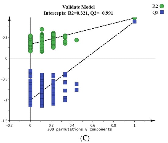 (A) Principal component analysis (PCA) model of volatile fragrant compounds (VFCs) in Wuyi rock teas (WRTs) with four different cultivars; (B) Partial least squares discriminant analysis (PLS–DA) model of VFCs in WRTs with four different cultivars; (C) Validation model of the PLS–DA model.