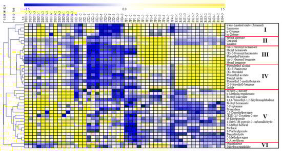 Furthermore, the four cultivars of WRTs samples were well distinguished by the PLS-DA model (Figure 2B; R2Y = 0.946, Q2 = 0.837) using the Pareto scaling model, thereby indicating that some significantly different VFCs existed among DHP, RG, SX, and JF. Moreover, the validation model for the 200 repeated calculations (Figure 2C) showed no overfitting phenomenon in the obtained PLS-DA model (R2 = 0.321, Q2 = −991). A total of 40 components were further identified as the key differential VFCs among the four types of WRTs, following the selection principle of variable importance in the projection (VIP) values higher than 1.0 in the PLS-DA model [24,25] and p-values lower than 0.05, as determined by the Kruskal–Wallis non-parametric test [26]. Thereafter, detailed and visually apparent differences among different groups of WRTs were presented by HCA after normalizing the peak area data. As shown in Figure 3, the concentration distribution of key differential VFCs was visually presented by the heat map, and their distribution trends were generally divided into six classes, including 4, 3, 6, 8, 17 and 2 compounds in classes I–VI.