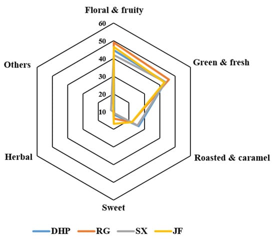 Overall, the AIs of the aroma-active compounds ranged from 2.0−3.4 (DHP), 2.3−3.4 (RG), 1.0−3.0 (SX) and 1.5−3.3 (JF) in class A; 2.0−3.3 (DHP), 2.3−3.3 (RG), 1.8−3.3 (SX), and 2.0−3.4 (JF) in class B; 2.3−3.3 (DHP), 2.4−3.0 (RG), 2.4−3.3 (SX), and 2.0−3.2 (JF) in class C; 2.0−3.4 (DHP), 2.4−3.2 (RG), 2.0−3.2 (SX), and 2.3−3.2 (JF) in class D; 2.0−3.0 (DHP), 2.0−2.8 (RG), 2.0−3.0 (SX), and 1.7−3.0 (JF) in class E; 2.0−2.8 (DHP), 2.0−3.3 (RG), 2.3−3.7 (SX), and 2.2−3.0 (JF) in class F. Furthermore, the summarized AI values of the above six odor classes for different WRTs were presented as radar graphs (Figure 4), and four similar aroma profiles were observed with the predominant performances in “floral & fruity” (42.0−49.1 of total AI values) and “green & fresh” attributes (43.2−46.0 of total AI values), moderate performance in “roasted and caramel” (21.8−26.4 of total AI values), and nearly equal and lower proportions in other attributes (9.6−16.8 of total AI values). Specifically, the AIs of the “floral & fruity” attribute of RG and JF were obviously higher than those of DHP and SX, while the opposite appearance was observed for the “roasted and caramel” attribute. The highest AI values of “floral & fruity” (49.1) and “green & fresh” (46.0) were exhibited by the RG sample. Additionally, the lowest AI value of the “green & fresh” attribute was obtained in JF (43.2), while its “sweet” attribute (16.8) was significantly higher than in other types of WRTs.