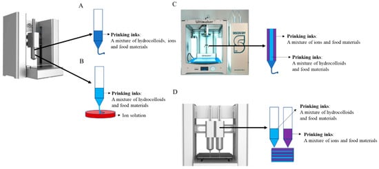 Combination mode between ions and hydrocolloids in the 3D printing process to enhance the printability of raw food materials (A) single nozzle printing with the mixed materials (B) single nozzle printing with the separated material (C) single nozzle printing with a coaxial nozzle (D) printing with double nozzles (arrow meaning where the nozzle is placed) (Reprinted with permission from Vancauwenberghe et al., 2018 [26]. © 2018, Elsevier Ltd., Amsterdam, The Netherlands) [26].For fruits and vegetables rich in high starch/protein content, these food materials have a good self-supporting ability, but they often break lines in the process of printing due to the rigid network structure. One solution is to add lubricants such as fat, phospholipids, or small molecules such as maltose and catechin to increase the softness of the network structure. Teng et al. [27] found that the addition of oils changed the rheological properties of Cordyceps flower powder and reduced the phenomenon of line breakage. Zeng et al. [28] found that catechin or procyanidin was attributed to improving the printability of starch-based materials due to the enhanced softness of the lines. Another solution is to use the physical field (for example, ultrasound, microwave, and radio frequency) or chemical methods to pretreat the raw materials in order to change the rheological characteristics and network characteristics of the materials. Xu et al. [29] found that ultrasonic treatment could destroy the structure of the wheat starch-papaya system, reducing viscosity and hardness, while increasing the ratio of bound water and improving the ability to retain its shape. Maniglia et al. [30] found that ozone-modified cassava starch increased the number of carbonyl groups and carboxyl groups, and the modified starch showed the lowest apparent viscosity, improved gel texture and good printability at all temperatures.