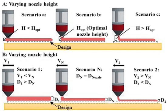 Effect of different nozzle heights (A) and different printing speeds (B) on streamline accuracy (Reprinted with permission from Dick et al., [20]. © 2019, Elsevier Ltd., Amsterdam, The Netherlands) [20].