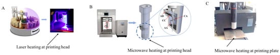 Examples of an existing integration device including printing and heating (A) laser heating (B) microwave heating at printing head (C) microwave heating at printing plate (Reprinted with permission from Hall et al., [80]. © 2021, Frontiers Ltd., Lausanne, The Switzerland.) [80].
