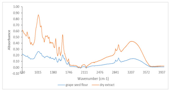 | Grape seed flour | 7182.53 ± 6.12 | 3500.52 ± 66.45 | 4716.75 ± 131.88 | 5936.76 ± 96.42 |