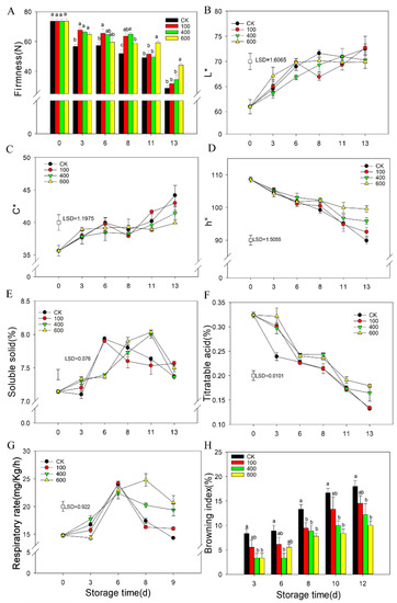 Fruit firmness is one of the most important indicators for fruit ripening. As shown in Figure 1A, the fruit firmness decreased gradually with fruit storage under controlled conditions. All the melatonin treatments delayed the decrease in fruit firmness and maintained higher fruit firmness compared with the control (CK) group, particularly for the 600 μmol·L−1 treatment, which had significantly higher firmness than the other treatments at the end of storage (Figure 1A). The color of the peel was primarily evaluated by L*, C*, and h° values, which indicate the brightness, color saturation and the hue angle of the peel, respectively. As shown in Figure 1B, the L* value gradually increased with fruit ripening for the control group. No significant difference was observed between the melatonin treatment groups and the control group for the L* value (Figure 1B). The C* value of fruit increased with fruit ripening, and no significant difference was observed between the different groups (Figure 1C). The h° value gradually decreased with fruit ripening. The melatonin treatments delayed the decrease in h° value, which resulted in fruit with a higher h° value than the control during later storage (Figure 1D).