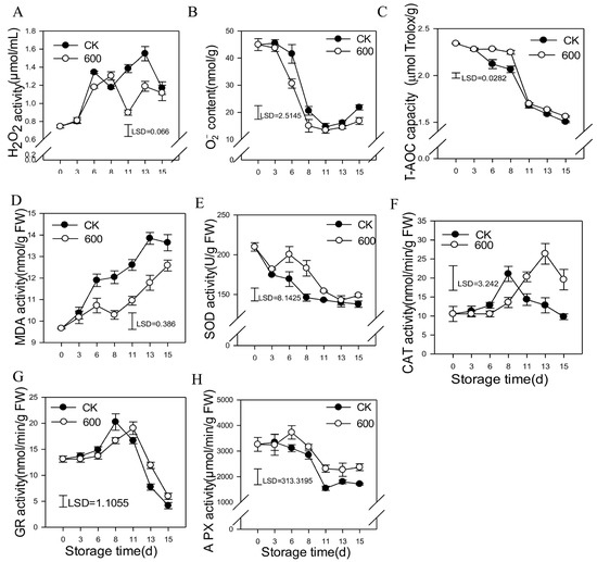 Effects of melatonin on the metabolism of reactive oxygen species in guava fruit. (A) the effect of melatonin treatment on H2O2 content; (B) the effect of melatonin treatment on O2− content. (C) the effect of melatonin treatment on T-AOC capacity; (D) the effect of melatonin treatment on the MDA content; (E–H) the effect of melatonin treatment on the activities of SOD (E), CAT (F), GR (G) and APX (H). Each data point represents the mean ± S.D. (n = 3). Least significant differences (LSDs) were calculated to compare significant effects at the 5% level. CK: control group; 600: 600 μmol·L−1 melatonin treatment group.