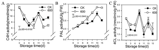 Effects of melatonin treatment on enzyme activities of the phenylpropanoid pathway in guava fruit. (A–C), the effect of melatonin treatment on the activities of C4H (A); PAL (B) and 4CL (C). Each data point represents the mean ± S.D. (n = 3). Least significant differences (LSDs) were calculated to compare significant effects at the 5% level. CK: control group; 600: 600 μmol·L−1 melatonin treatment group.