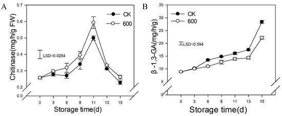 Effect of melatonin treatment on the activities resistance related enzymes in guava fruit. (A,B) the effect of melatonin treatment on the activities of CHI (A); β-1,3-GA (B). Each data point represents the mean ± S.D. (n = 3). Least significant differences (LSDs) were calculated to compare significant effects at the 5% level. CK: control group; 600: 600 μmol·L−1 melatonin treatment group.