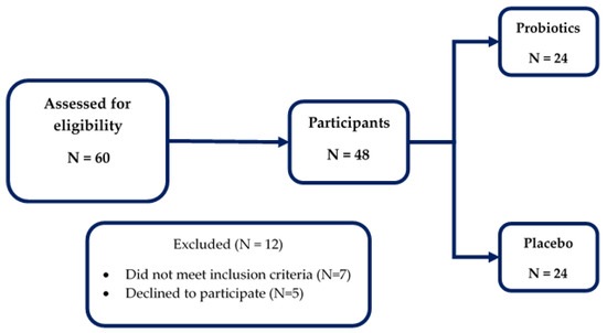 Random Allocation Software was used to randomize the subjects, and the researchers and participants were blinded to the group assignment. The participants were randomized to receive either a probiotics supplement or placebo for 12 weeks and asked to come to the study center for follow-up. The screening and enrollment details are shown in Figure 1.