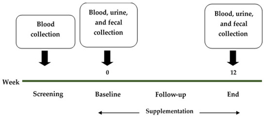 The samples (blood, urine, and feces) were collected at the screening point, baseline, follow-up, and the end of the study (Figure 2).