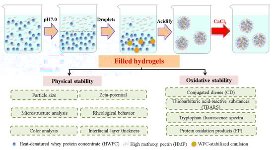 Traditionally, emulsion systems are classified as oil-in-water (O/W), water-in-oil-in-water (W/O/W), oil-in-water-in-water (O/W/W), and oil-in-water-in-oil (O/W/O) emulsions. Emulsion systems have attracted widespread attention as a delivery system for the encapsulation or delivery of bioactive compounds into aqueous foods [1,2]. Among these systems, filled hydrogels are considered a typical representative O/W/W emulsion system, and they exhibit considerable application prospects for the delivery of bioactive compounds [3,4]. Filled hydrogels are prepared by directly incorporating an O/W emulsion into a phase-separated-based water-in-water (W/W) emulsion based on two biopolymers (mainly protein and polysaccharide) [5]. Compared to other emulsion systems, filled hydrogels possess unique advantages, such as higher oxidative stability, more effective control of the release of bioactive compounds, and enhancement of the desirable flavor of low-fat foods [2,6,7,8]. For the application of filled hydrogels for the manufacture of food products, it is essential that they can adapt to numerous environmental conditions (e.g., temperature, mechanical mixing speed, pH, and ionic strength) [9]. Matalanis, Lesmes, Decker, and McClements reported that adjusting the pH to 5.0 promoted a shift in their adsorption ability of polysaccharides from continuous phase onto proteins to the dispersed phase around protein-coated droplets [4]. In addition, Cai, Du, Zhu, and Cao reported that sodium chloride addition shields a part of the charge of biopolymers and affected electrostatic interactions between biopolymers, which deteriorated the properties of the final product with respect to lower emulsion stability [10]. Furthermore, owing to the thermodynamic instability of filled hydrogels during a longer storage period, they are susceptible to an oxidative instability phenomenon.