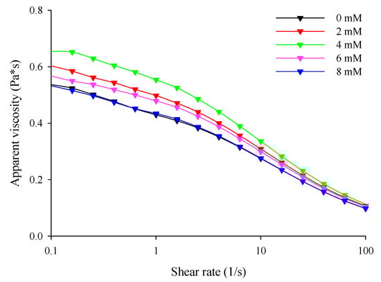 With an increase in CaCl2 levels (0–4 mM), the zero-shear viscosity () of the filled hydrogels increased significantly (p < 0.05). This means that the incorporation of Ca2+ increased the resistance of the hydrogel to flow (Table 3). Meanwhile, the flow curve revealed that the filled hydrogels containing CaCl2 exhibited higher apparent viscosity than that without CaCl2, and the apparent viscosity of the filled hydrogels increased with increasing CaCl2 levels (Figure 2). This phenomenon is similar to that observed in the study of Matalanis and McClements [1], who reported that CaCl2 increased the apparent viscosity of filled hydrogels fabricated using HMP and sodium caseinate. When CaCl2 was added into the filled hydrogels, the Ca2+ distributed in the continuous phase promoted crosslinking between the carboxyl and ester phosphate groups present on the HWPC or HMP molecules on the surface of the droplets, thus enhancing the apparent viscosity of the filled hydrogels [15]. However, at CaCl2 levels above 4 mM, decreased, and the apparent viscosity decreased (p < 0.05). This phenomenon could be attributed to the fact that the excessive bridging effect induced by Ca2+ resulted in the excessive aggregation of proteins and the flocculation of droplets, thus having effects on the apparent viscosity of the sample [28]. Additionally, the time constant (λ) of the samples at different CaCl2 levels further verified the apparent viscosity results of the sample.