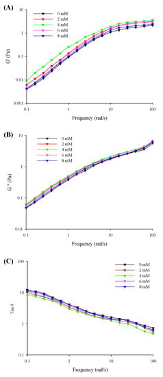 Storage moduli (G′, A), loss moduli (G″, B), and phase angle (tan δ, G″/G′, C) of the freshly prepared filled hydrogels containing different CaCl2 levels as a function of frequency.