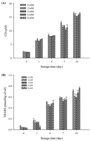 The conjugated diene (CD) is the primary oxidation product of lipids in the filled hydrogel samples, which was analyzed according to the method of Corongiu and Banni [20]. Briefly, 1.5 mL of isooctane-isopropanol (3:1, v/v) was added into 0.1 mL of filled hydrogels, after which the mixture was vortexed at 3 × 10 s. After mixing, the mixture was centrifuged at a speed of 530 rpm for 2 min, after which the obtained supernatant was mixed with 4.8 mL of isooctane. Lastly, the absorbance of mixtures was determined at 234 nm.