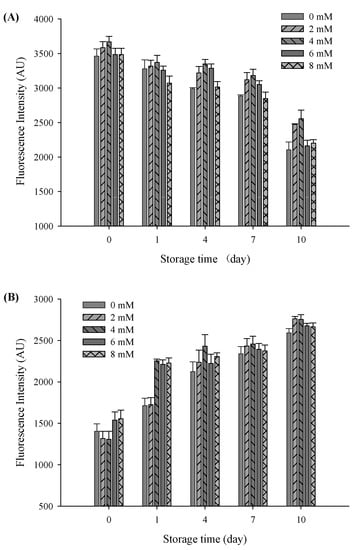 The oxidative stability of filled hydrogels containing CaCl2 for the influence of protein oxidation was compared to those of the samples without CaCl2. To this end, the protein oxidative stability of filled hydrogels at different CaCl2 levels was measured. A decrease in the intrinsic fluorescence of tryptophan is considered as a vital parameter for illustrating protein oxidative stability. At a storage time of 0 days, the intensity of tryptophan fluorescence gradually increased with increasing CaCl2 levels, and the highest intensity value was observed at a CaCl2 level of 4 mM (p < 0.05, Figure 7A). In addition, the incorporation of CaCl2 induced the interaction of Ca2+ with free anionic carboxyl groups of proteins, thus increasing the intrinsic fluorescence of tryptophan. However, tryptophan fluorescence decreased with a further increase in CaCl2 levels to 8 mM. The reduction in tryptophan fluorescence was mainly due to excessive protein aggregation and flocculation of droplets, which resulted in a decrease in the exposure of tryptophan. After subjecting the filled hydrogels to storage for 10 days, the intensity of the tryptophan fluorescence of the filled hydrogels decreased continuously (p < 0.05), which revealed that the protein oxidation occurred throughout the storage period [40]. Fluorescence quenching during storage might be due to protein modification and crosslinking caused by oxidation, which reduced the exposure possibility of tryptophan [41]. After storage for 10 days, with the increase in CaCl2 levels, the intensity of tryptophan fluorescence increased and then decreased (p < 0.05), and the highest fluorescence value was observed at a CaCl2 level of 4 mM. These results indicated that an appropriate Ca2+ level can remarkably prevent the oxidation of proteins, and excessive Ca2+ levels can accelerate the rate of proteins oxidation throughout the entire storage time.