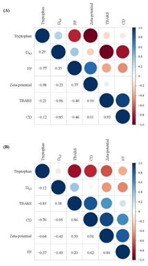 As shown in Figure 8, correlation analysis showed that the particles size (D4.3) of the freshly prepared filled hydrogels exhibited a high negative correlation with CD and TBARS values (R = −0.85 and R = 0.96), whereas the zeta-potential exhibited a slight positive correlation with CD and TBARS values (R = 0.01 and R = 0.10). These results are consistent with those of a previous study that reported that the particle size of droplets exhibited a negatively correlation with the TBARS value of prepared filled hydrogels. Moreover, the CD and TBARS values of the freshly prepared filled hydrogels exhibited a negative correlation with tryptophan fluorescence intensity, indicating that the oxidation of lipids of the filled hydrogels had a significant effect on the oxidation of proteins. This result was similar to that observed by Estévez et al. [42], who reported that there was a strong negative linear correlation between tryptophan emulsion fluorescence and primary oxidative products. Lipid oxidation products promoted protein oxidation during the oxidation process [44], which could be ascribed to the fact that lipid-derived oxidative products reacted with amino acids/peptides/proteins, thereby resulting in various protein oxidative products. Additionally, unabsorbed proteins in the aqueous phase or adsorbed protein at the interfacial layer affected the lipids oxidation [45,46]. In addition, after incubation for 10 days, the positive correlation between the lipid oxidation values (CD and TBARS values) and protein oxidation values (tryptophan fluorescence intensity and FP) increased. This indicated that the intensity of the extent of protein and lipids oxidation increased, and the interaction between protein and lipid oxidation became more significant with increasing storage time.