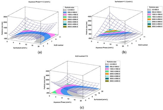 ANOVA (Table 2) showed that three coefficients (c1, c3, and c13) of the quadratic model, Equation (1), were statistically significant (p < 0.05). The HLB number (X3) and the aqueous phase content (X1) had a stronger effect on droplet size than the surfactant content. The significance of the HLB number and the surfactant content and their effect on particle size were previously reported [,].