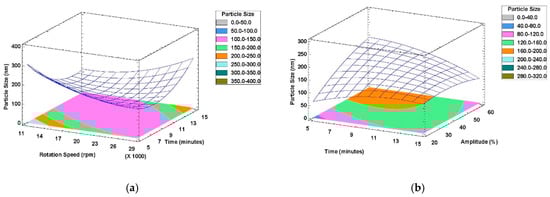 The interaction of time and amplitude on emulsion droplet size in nanoemulsions prepared with the ultrasonic homogenizer is shown in Figure 2b: time variation did not have a noticeable effect on droplet size at lower amplitudes. However, as mentioned above, the amplitude is the most significant factor in ultrasound-assisted emulsification experiments. As reported in other studies [,,], for shorter time periods (5–10 min), increasing the amplitude has a negative effect on emulsion droplet size, while for longer time periods (10–15 min), no considerable effect was observed by varying the amplitude.