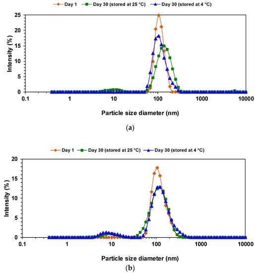 Figure 3a,b shows no significant changes in the average droplet size of optimally formulated nanoemulsions, with no apparent variations in visual stability after 30 days of storage. No change was observed in the droplet size distribution of the optimal nanoemulsion prepared with the rotor-stator mixer (Figure 3a), despite a slight PDI increase during the storage period at room temperature. However, a lower temperature had a better effect on its stability and caused a considerably lower PDI with the same particle size.