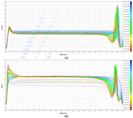 BS profiles of optimally formulated W/O nanoemulsions through 30 days of storage at 25 °C: (a) rotor-stator mixer; (b) ultrasonic homogenizer.