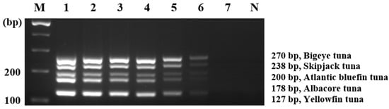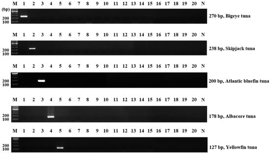 To determine the optimal concentration of multiplex PCR primer sets, we performed preliminary experiments (data not shown). As a result, we found that the multiplex PCR condition (i.e., 1.4 µM/1.2 µM/0.4 µM/0.6 µM/1.2 µM for bigeye tuna/skipjack tuna/Atlantic bluefin tuna/albacore tuna/yellowfin tuna, respectively) was most suitable considering the cross-reactivity of the primer sets and sensitivity. The multiplex PCR was optimized by setting the annealing temperature and time to 62 °C and 30 s, respectively, which is the same as single PCR. This optimized multiplex PCR was developed for the simultaneous identification of the five types of tuna. Additionally, the specificity of multiplex PCR was confirmed by gel electrophoresis. The target fish species was amplified by its specific primer and no nonspecific band or false-positive amplification of the negative control group was observed (Figure 3).